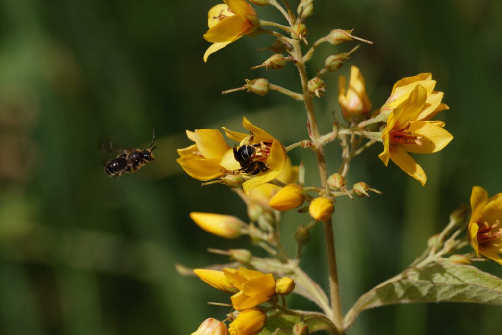 Ein Beispiel dafür ist die Auen-Schenkelbiene. Diese Wildbiene ist auf den Gilbweiderich spezialisiert. Anders als die meisten Blütenpflanzen produziert der Gilbweiderich keinen Nektar, sondern ein fetthaltiges Öl. Genau dieses Öl sammelt die Biene und nutzt es zur Versorgung ihrer Larven. Ohne den Gilbweiderich kann sich diese Bienenart nicht fortpflanzen – verschwindet die Pflanze aus den Gräben, verschwindet auch die Biene.